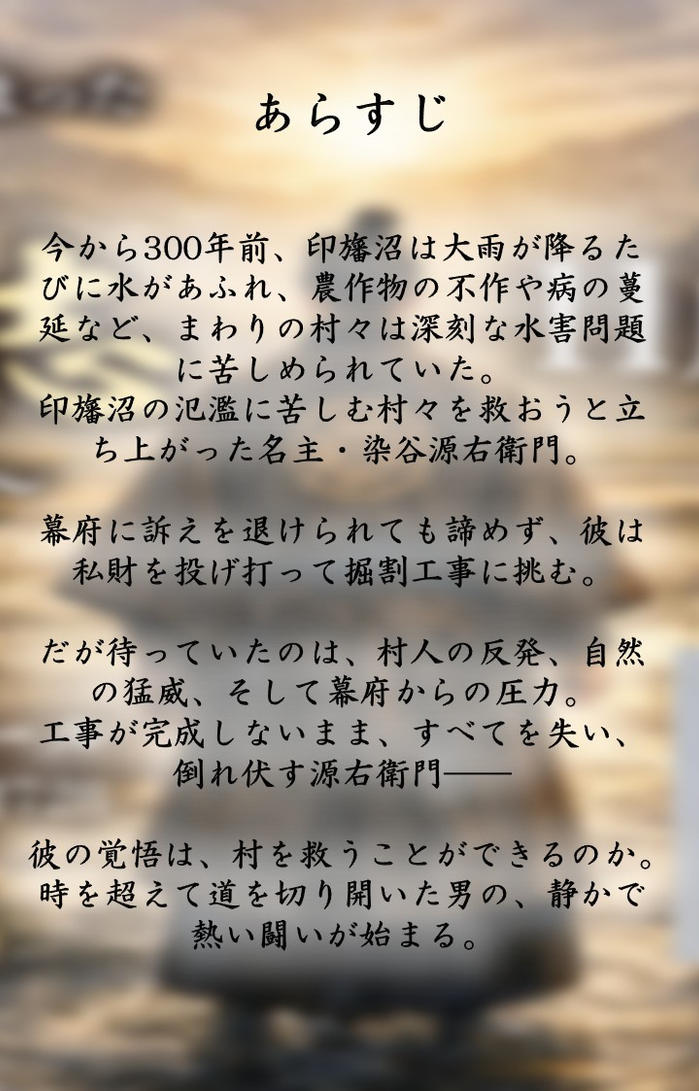 - 江戸時代、印旛沼の水害に苦しむ村々のため、私財を投じて掘割工事に挑んだ平戸村(現・八千代市)の名主、染谷源右衛門氏の生き様を描きながら、教科書には載ることのない八千代市の忘れてはならない歴史の一辺を綴る物語です。