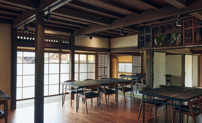• きのえねomoyaは、敷地内に点在する6つの建造物とともに、国の登録有形文化財に指定されています。永い年月を経て味わい深さを増した梁や柱、細かな職人技が美しい欄間や長押飾りなどの旧き佳き意匠と、酒造りで使われていた古材を再利用した客席テーブルや、作家によるランプシェードなど、現代のデザインが調和する空間も、見どころの一つです。