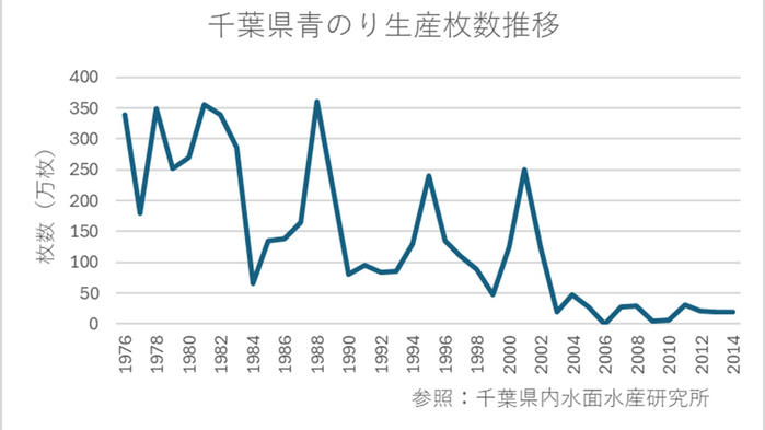 - 県内では白子町・長生村・いすみ市で青のり養殖が行われていますが、近年は海洋環境の変化、特に海水温の上昇や貧栄養化の影響により、生産量が大きく減少しています。