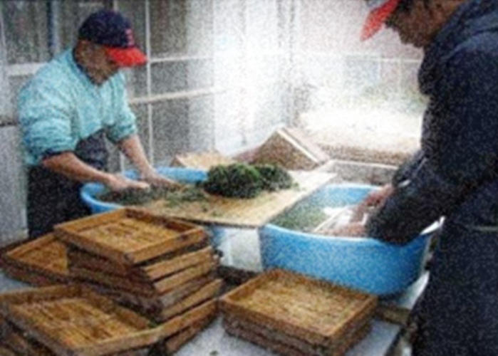 摘み取った青のりは、黒海苔(焼海苔)と同じように板状に加工される伝統製法で受け継がれてきました。