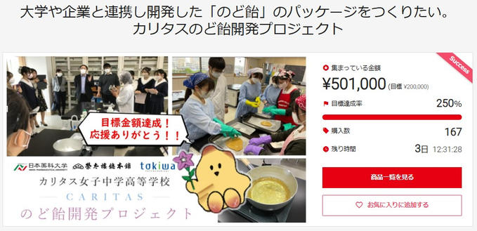 - 私たちは昨年より日本薬科大学さん、榮太樓總本鋪さん、常磐植物化学研究所さんと連携してカリタスオリジナルのど飴を制作しています。
