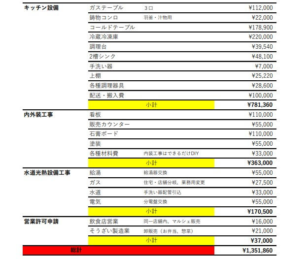 - 「うしくキッチン」をつくるには、以下の費用が必要になってきます。