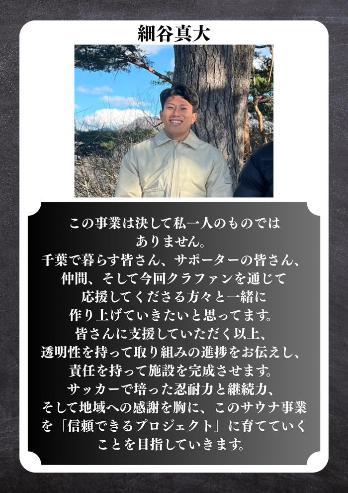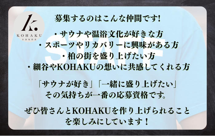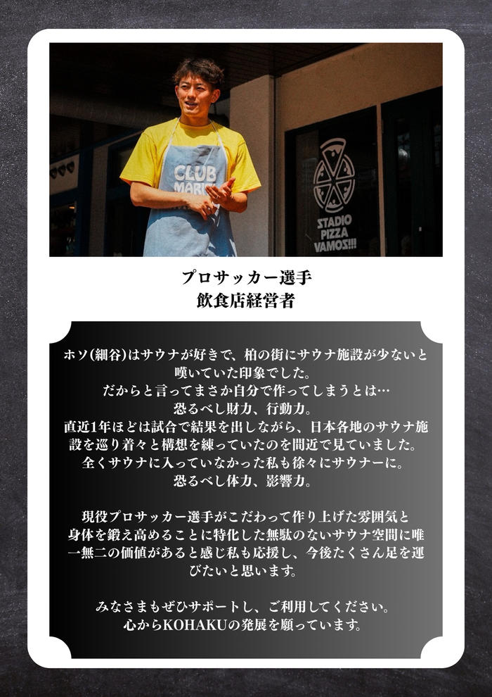 柏駅東口徒歩7分に、「sauna KOHAKU」(サウナ コハク)という“回復基地”をつくります。 サウナを通して、心と身体を整え、また前に進む力を届けたい。 プロサッカー選手・細谷真大の「リカバリーを通じて地元に恩返ししたい」という想いから始まり、 一つひとつの設計、温度、導線に“本格的なリカバリー”を追求しています。 人々が自分をリセットし、また挑戦できる場所—— それがKOHAKUです。 皆さんと共に、この空間を創り上げていきます。