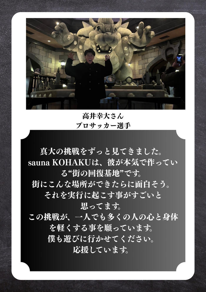 • 【細谷真大とサウナに入る券】 先着40人限定の特別イベント! 細谷真大と一緒にリカバリーを意識した入浴法や体験談を直接聞ける、ここでしか味わえない交流型リターンです。 1時間でサウナに入り、残りの1時間は細谷真大への質疑応答タイムを予定しております。 【内容】 ・細谷真大と1組20名で一緒に入る券 ・細谷真大サイン入OPEN記念サウナハット ・OPEN記念ステッカー ・KOHAKUドリンクセット