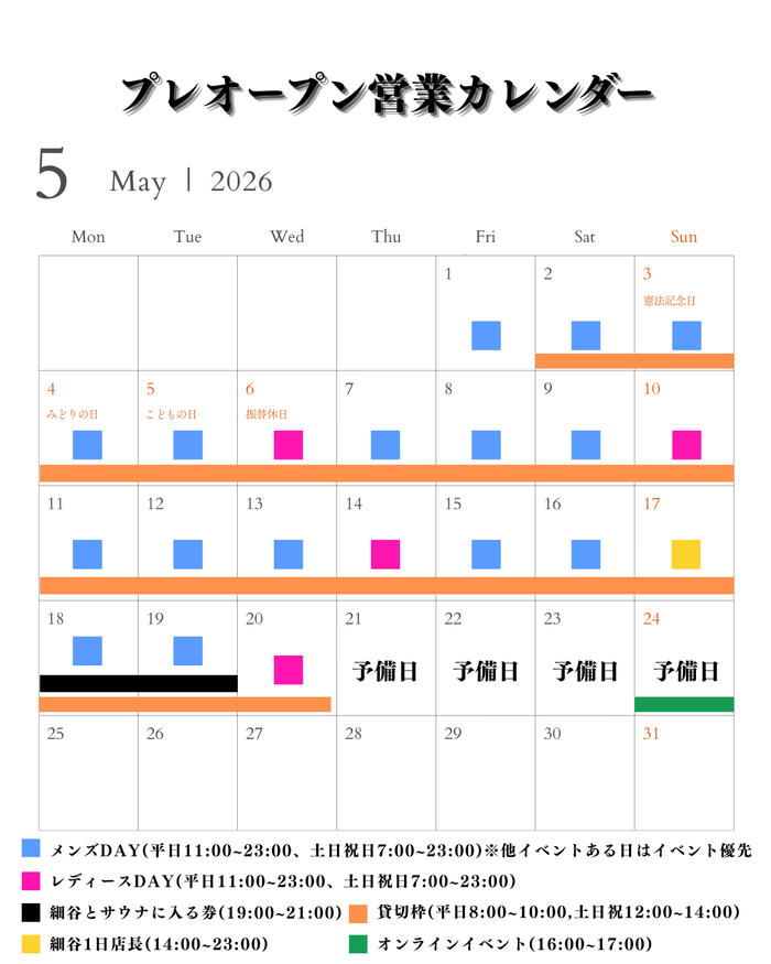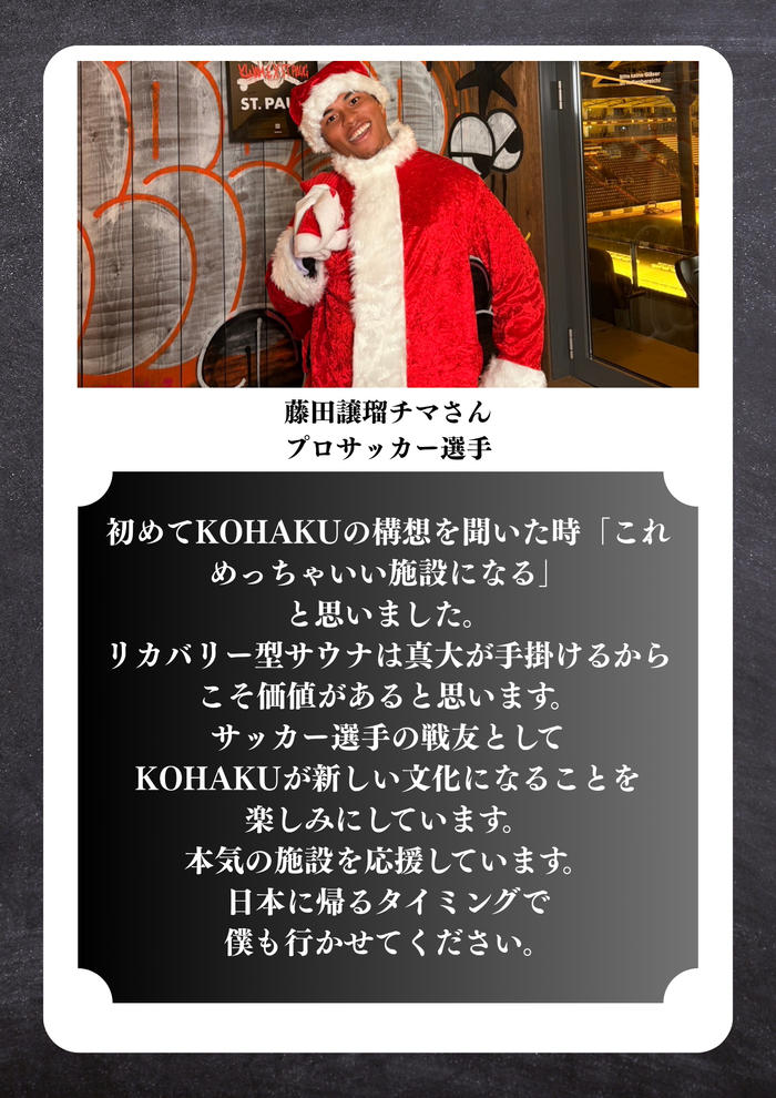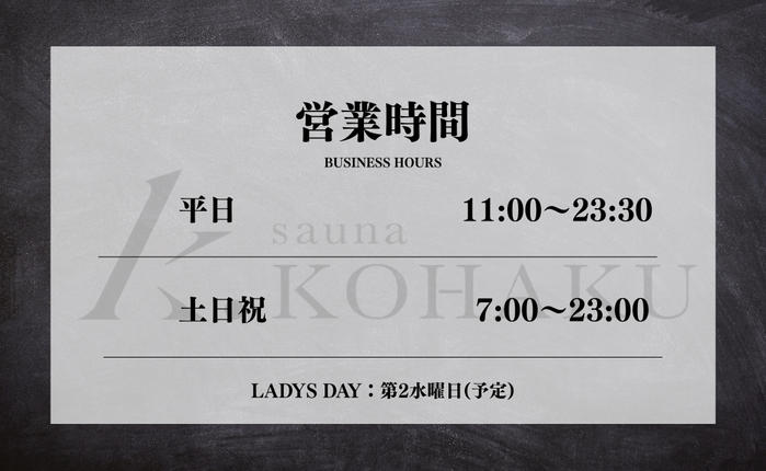• 【細谷真大1日店長招待券】 オーナー自らが店頭に立つ1日店長日にご招待! 80人限定イベント! 更に、当日から使える細谷真大サイン入りOPEN記念サウナハットをプレゼント! 【内容】 ・細谷真大1日店長招待券(施設利用1時間30分) ・細谷真大サイン入りOPEN記念サウナハット ・KOHAKUドリンクセット