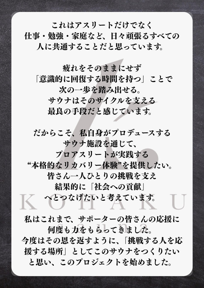 「支えられる側」から「支える側」になる手段のひとつとして、リカバリー型サウナ「saunaKOHAKU」を立ち上げる決意をしました。