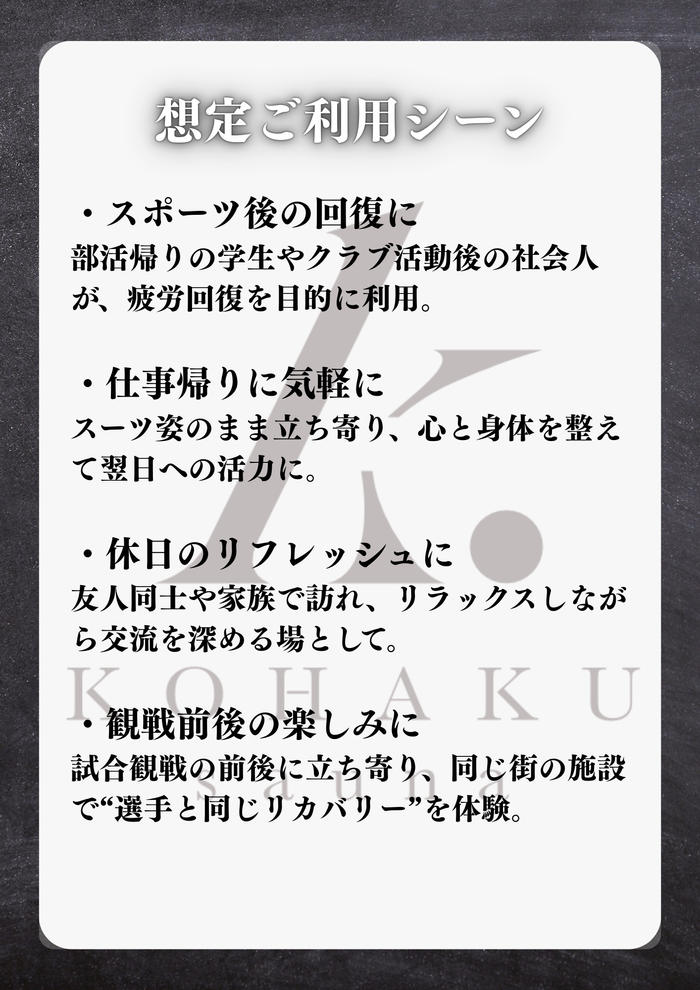 KOHAKUは、コンディションを調整するだけでなく、“もう一度、前に進むための力”を取り戻せる場所を目指しています。