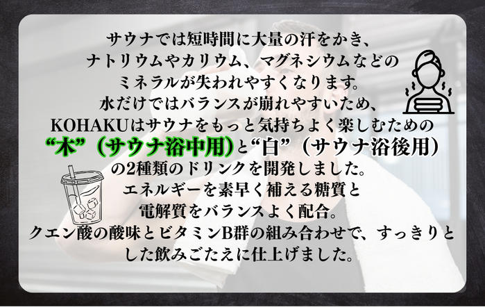 KOHAKUでは、身体を内側から整えるために、サウナ専用ドリンク「木(き)」と「白(しろ)」を開発しました。